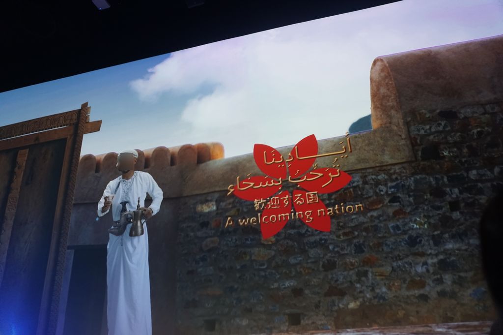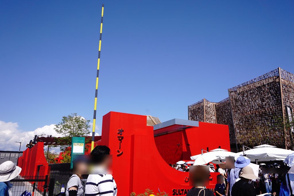 赤いパビリオン館が目を引きます。オマーンの国花・赤いバラをイメージしたのかなと思いましたが、オマーンの多様な自然と地形の特徴からインスピレーションを得ているとのこと。館内では オマーンの大地・人・水を映像で紹介していました。館外に出るとカフェもあり 赤いベンチで飲食できます。オマーンの王室の花壇には赤いバラが咲いています。シャボン玉の演出もある。ワゴン車ではバラのアイスを販売しています。情熱の国・オマーンを体感しました。